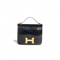 This Constance is in Gris Perle evercolor leather with rose gold hardware and has tonal stitching, a metal "H" snap lock closure, and adjustable shoulder strap. The interior is lined with Gris Perle lambskin leather and has a zip pocket with an Hermes engraved pull.